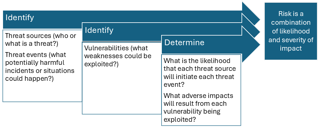 A side note about terminology: threat and risk are separate but related concepts. A threat is an actor or situation that has the potential to negatively impact a mission or entity, while risk is the negative impact adjusted for the probability of it occurring (Lawrenson et al., 2023).